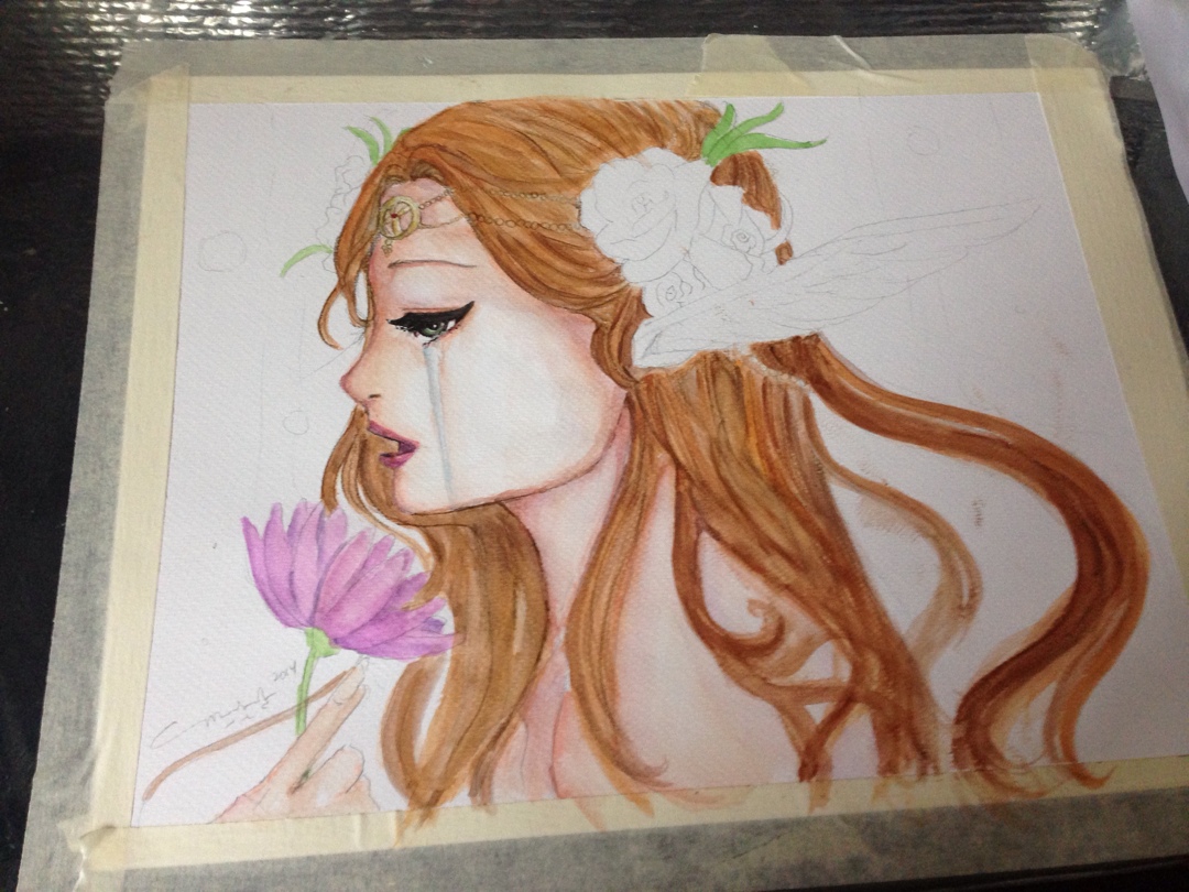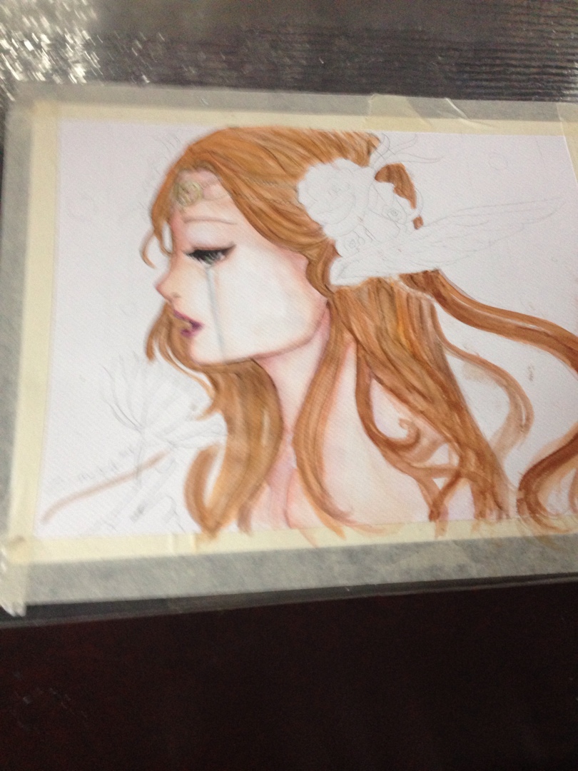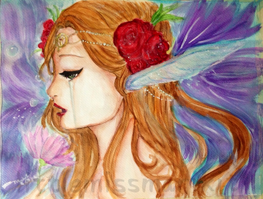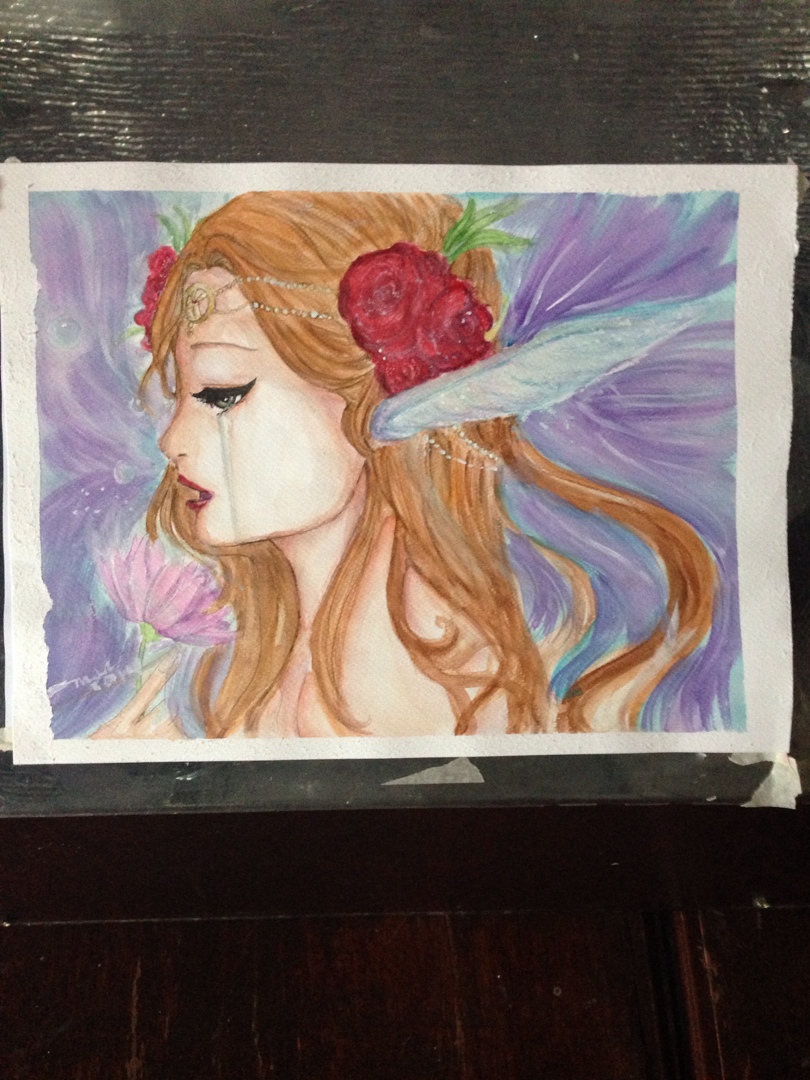 i started dropping in orange and gradiating it to color the skin. I also added some raw and burnt umber, reds and a bit of yellow to the mixi started to detail with the rigger brush blues and blacks and i colored in eyes with greens. for the tears, i did light blues and mixed a little grey and titanium white.. added blues and purple to skinstarted with the hair. now that took a really long time..: i mixed a lot of hues to get her hair flowing just sostarted to detail her flowers and jewelrythe wings were mix of blues purples and pinks with a lot of white…and add a radiating effect, some bubbles and shes done!!and there she is. the beauty is done!!