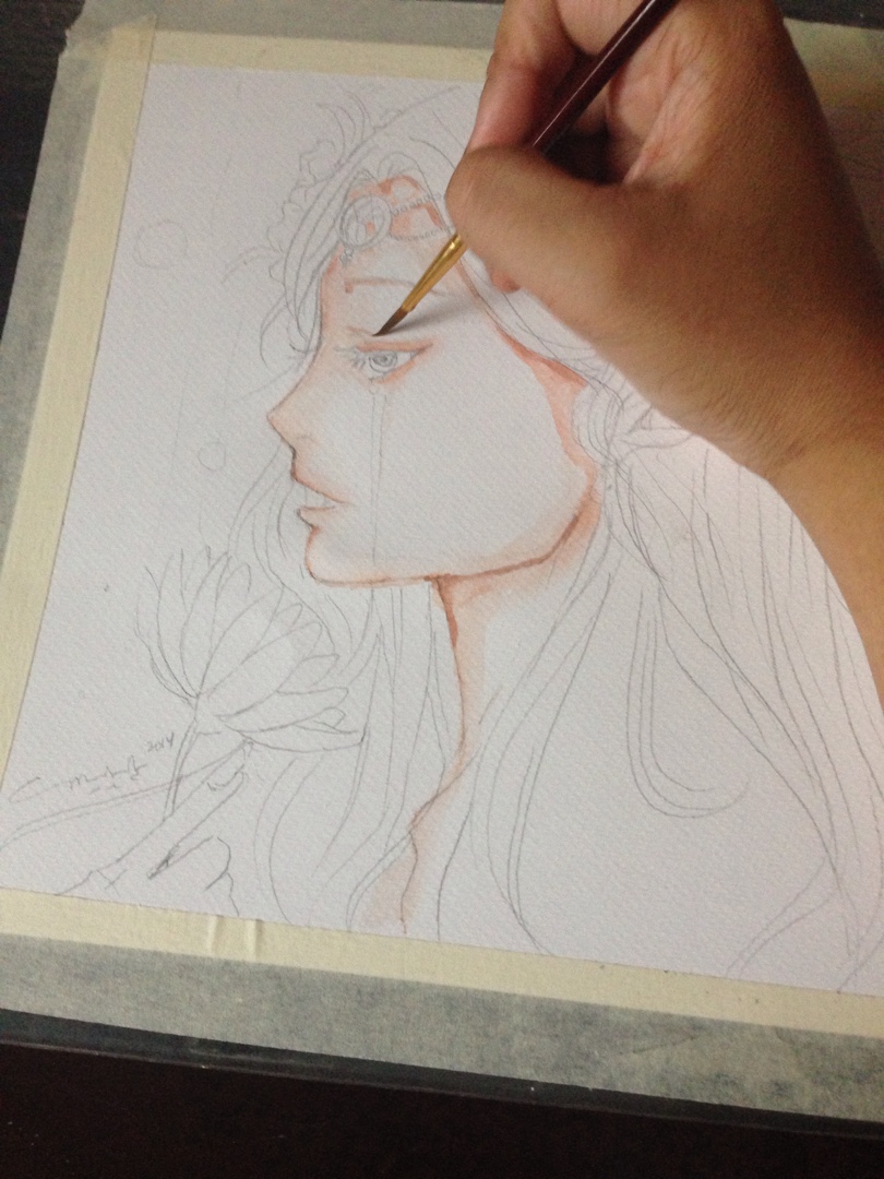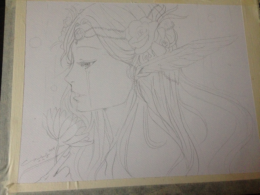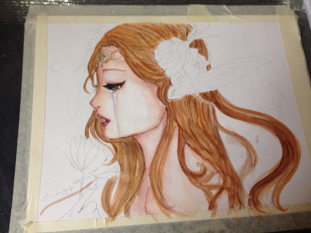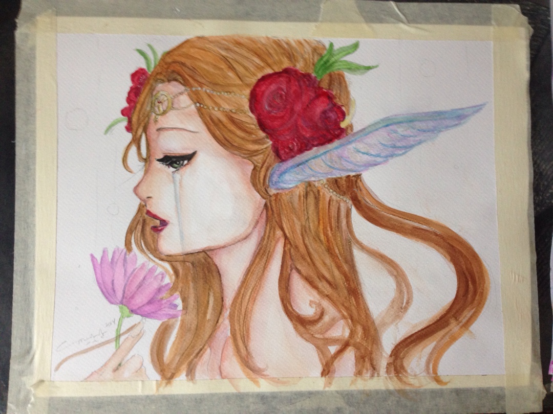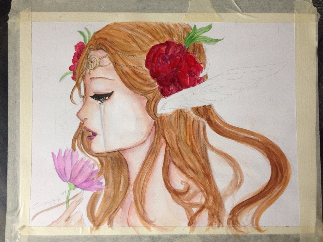 i started dropping in orange and gradiating it to color the skin. I also added some raw and burnt umber, reds and a bit of yellow to the mixi started to detail with the rigger brush blues and blacks and i colored in eyes with greens. for the tears, i did light blues and mixed a little grey and titanium white.. added blues and purple to skinstarted with the hair. now that took a really long time..: i mixed a lot of hues to get her hair flowing just sostarted to detail her flowers and jewelrythe wings were mix of blues purples and pinks with a lot of white…and add a radiating effect, some bubbles and shes done!!and there she is. the beauty is done!!