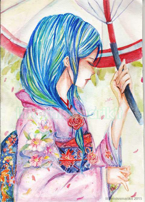 So I did the piece on the left a few weeks ago. It’s entitled “Ao Natsu” ( Blue Summer in English) the blue obviously came from her hair. It was the first time I painted hair like that, in streaks instead of full shades and I was inspired by some art I found on pixiv. The yukata’s design was from a wallpaper I found on Cherry blossoms and the obi and the thingie at the back was from a kimono on google. I mixed elements together to create this piece and I do hope you like it because I was surprised that I was able to control the paint and not put water all over it as I usually do XD.