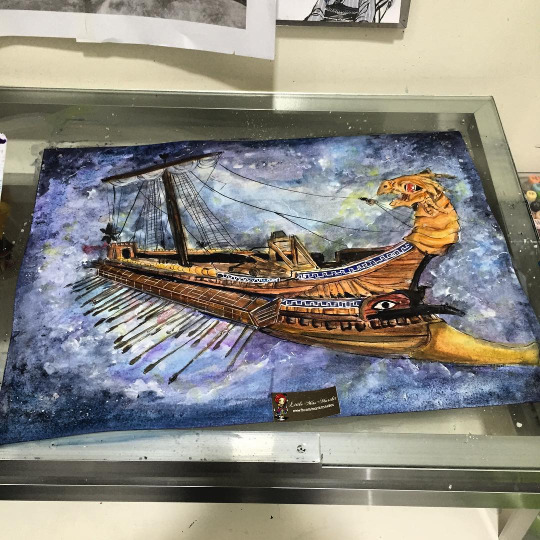 A beautiful masthead for a flying greek trireme. It was daunting to draw, but I managed to finish this Trireme with a lot of detail and actually made a sky background to g along with it. The first time to do a dark background. I wanted the effect that it was flying off the page and so i didnt really plan for the edge… (again with planning a piece) but I think its a pretty good take on the trireme, don’t you think? Leo would be proud of me. XD