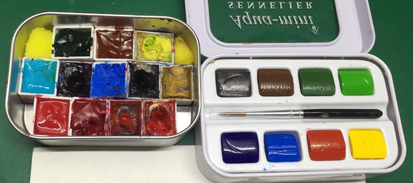 But as I was reading about people who do plein air art and travel journaling, I found that some carry their own palette in an altoid tin case. I also found an excellent tiny set from Sennelier from the Craft Central that was compact enough for my needs. So this is what I ended up with