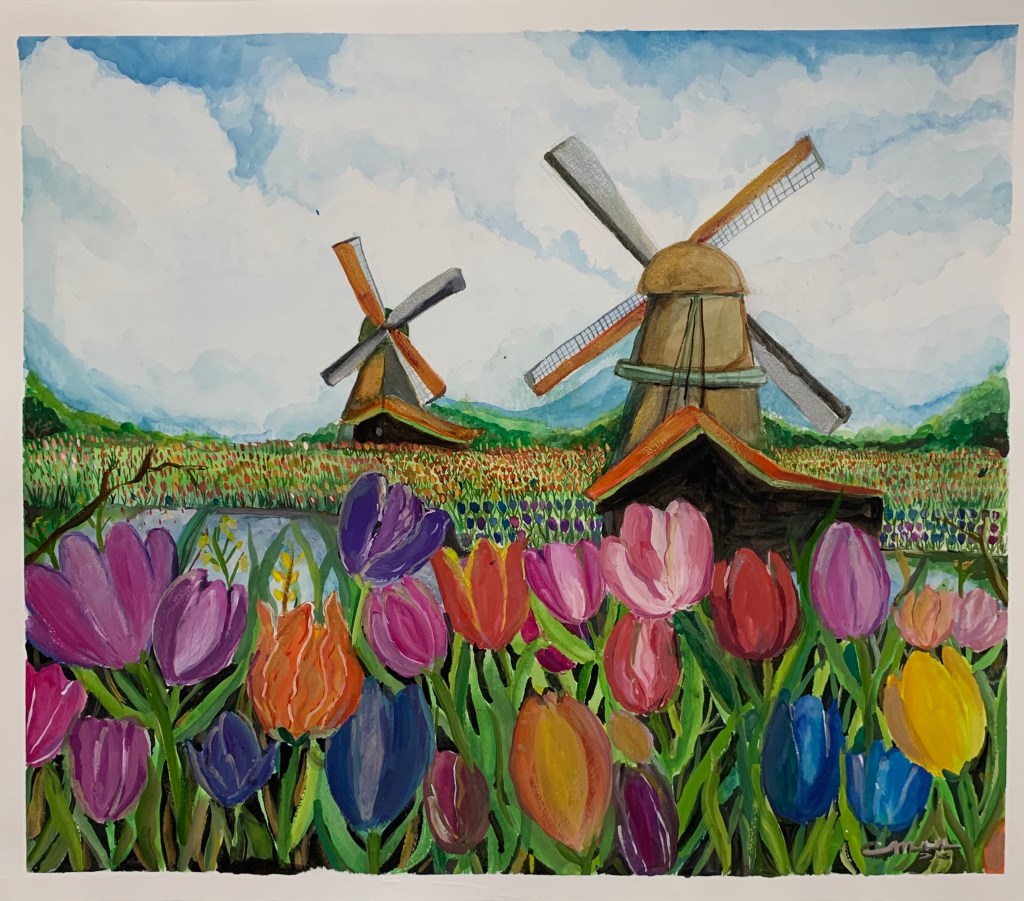 But it was quite the journey. The tulips in the back took me at least 3 days. The sky and the windmills were done in a day however, the flowers! THOSE FLOWERS really took me for a spin. I used a tiny brush to do the back flowers and I remembered a friend telling me that I should be patient and not be impatient or cross with my painting.