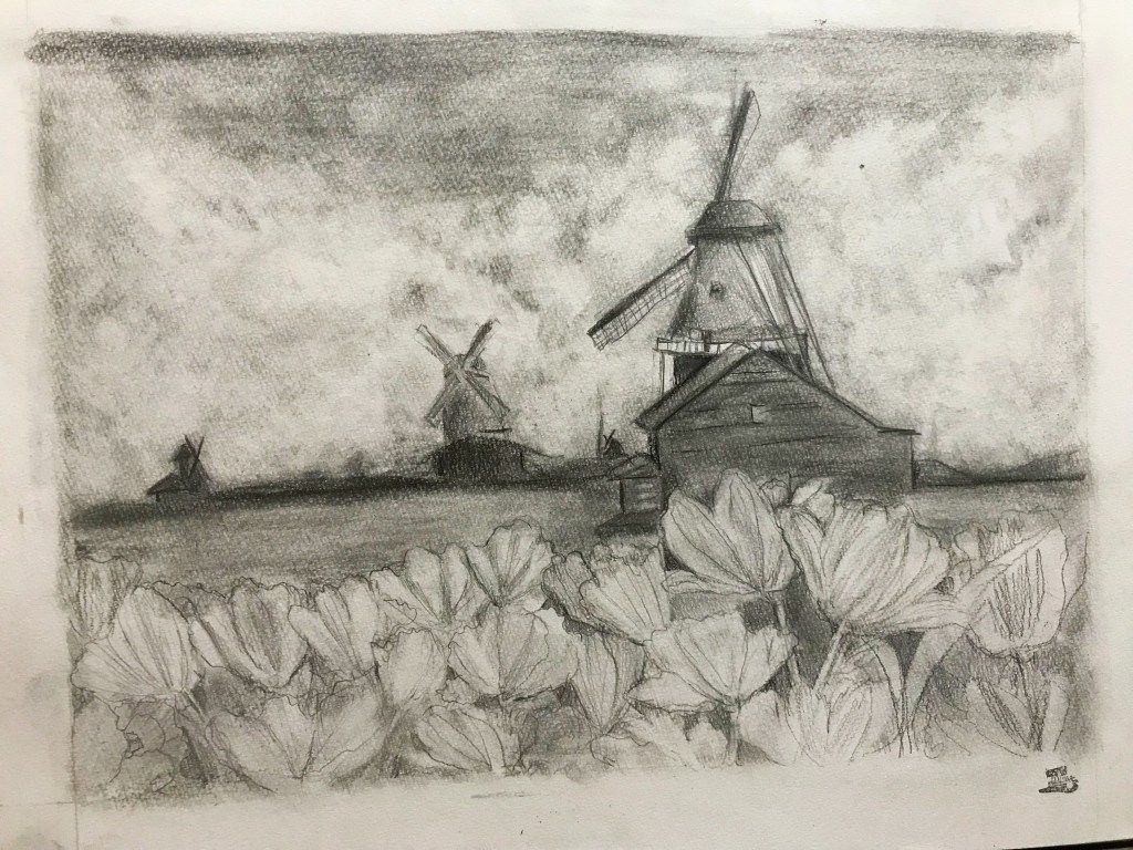 I started this painting as a present for my niece since we are remodelling her room for Christmas and this was my contribution to her room. She requested tulips and windmills so this is what I thought about. I thought it would be simpler, I already had the graphite set from my NH101 Days so I thought I would just put it on watercolor paper.