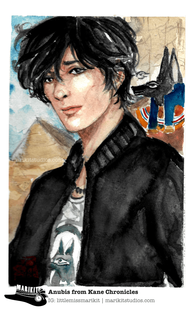 As a first offering to the gods and to the demigods, etc. I drew something from Kane Chronicles as suggested by my dear sister. It is Anubis , the Egyptian god, in his Riordanverse form. I took visual clues from Viria and the official one to create my version of this guy. He ended up looking like a lost member of a certain k-pop boyband, but I will take it.