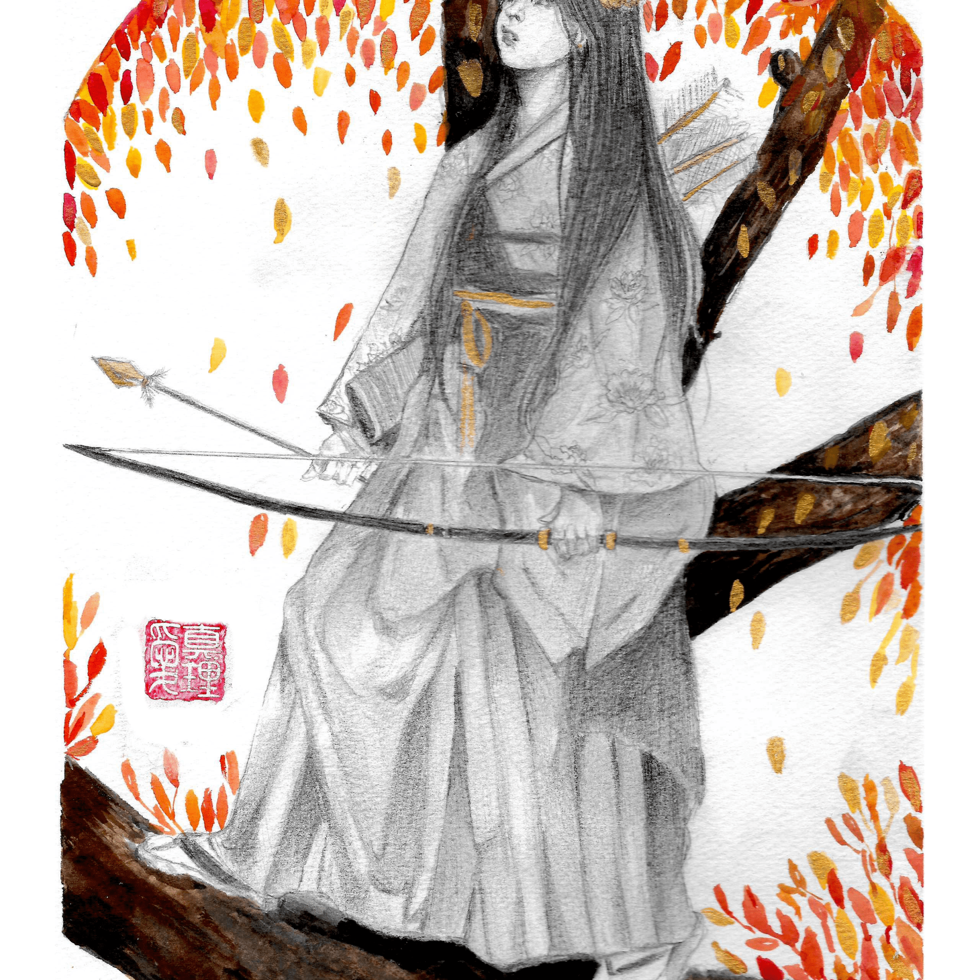 The samurai represents Courage. He is strong and a symbol of Fire. He represents the quiet strength. The Archer represents Patience and Hope. She is under a fall of detailed leaves, she represents earth.Finally the Ninja is vigilance and persistance to do whatever it takes to finish the mission. He represents water.